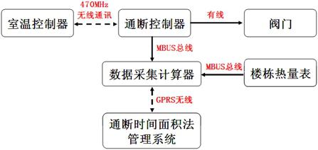 通斷時間面積法由以下幾部分組成:室溫溫控器(無線或有線)、通斷控制器及閥門(有線或無線)、數(shù)據(jù)采集計算器(有線或無線)、單元或樓棟熱量表、通斷時間面積法管理系統(tǒng)五大部分組成。